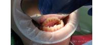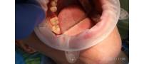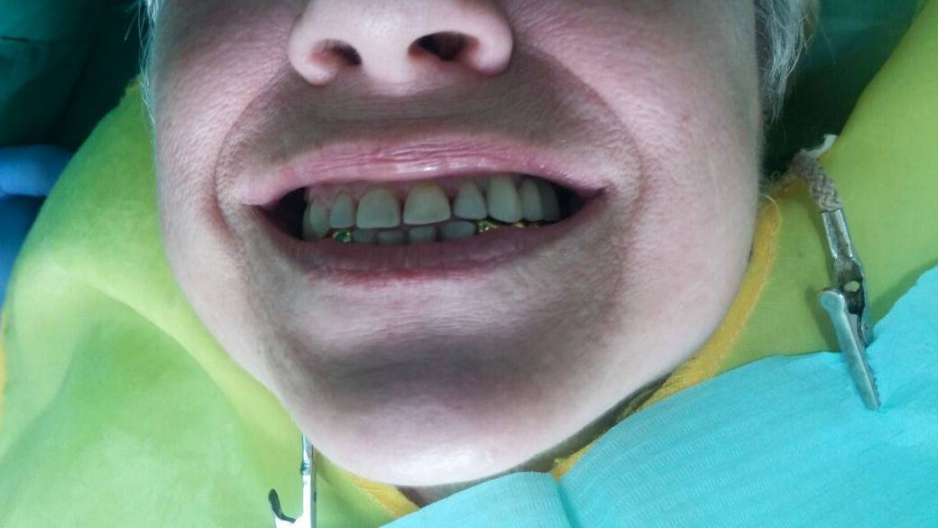 Депульпирование 1.3, 1.2, 1.1, 2.1, 2.2 зубов, изготовление индивидуальных культевых вкладок с последующим протезированием: металлокерамические коронки во фронтальном отделе, съёмный ацеталовый протез для восстановления жевательной эффективности.